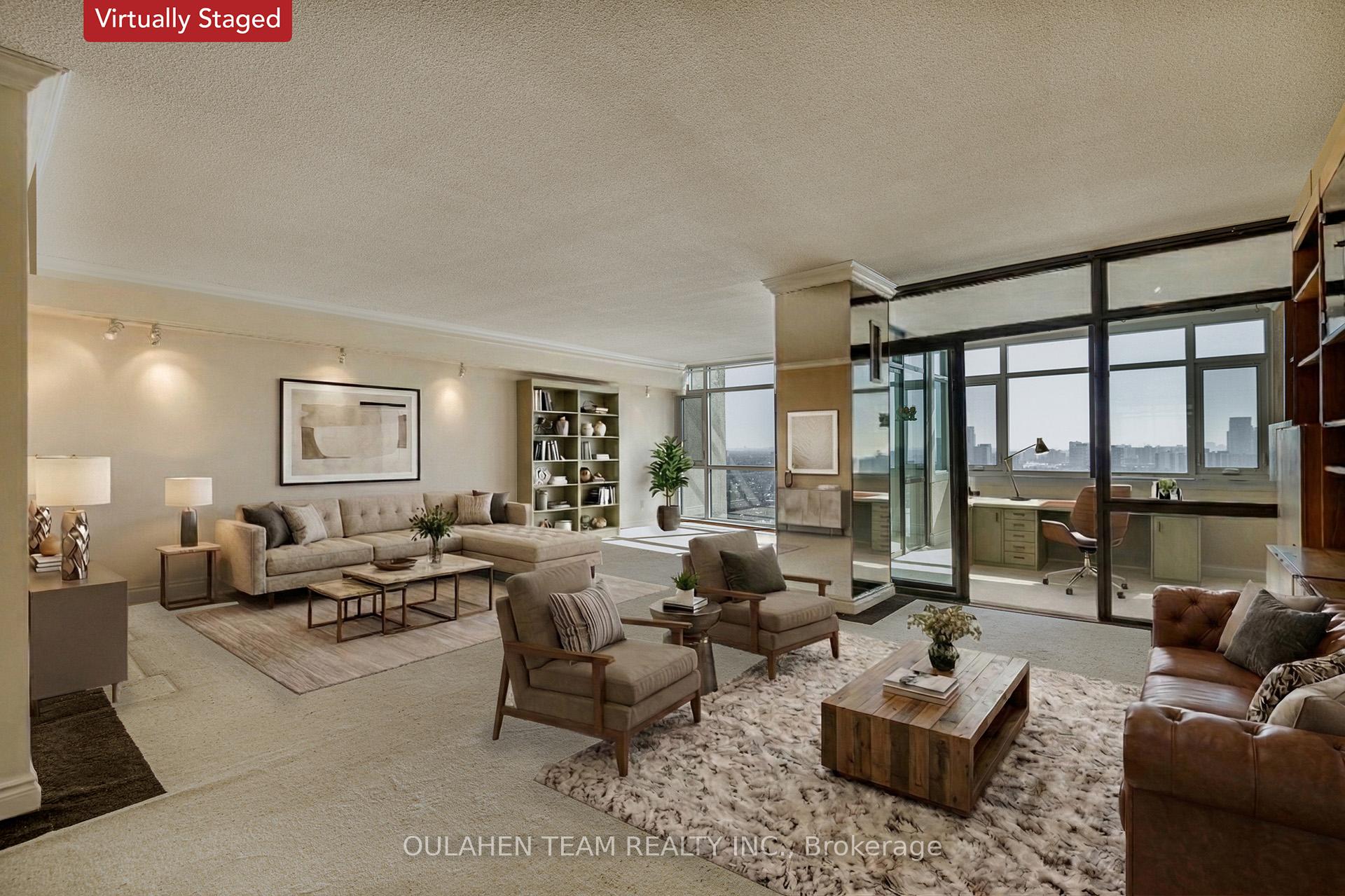 Bright and spacious 1,700 sq. ft. suite featuring wall-to-wall south facing windows that flood the entire unit with natural light, all on one level. The large eat-in kitchen offers a convenient flow to the dining area, perfect for everyday living and effortless entertaining. The spacious open-concept living and dining room provides plenty of room to host family and friends. Relax in the sun-filled enclosed sunroom with beautiful views of the city skyline, an ideal space for a home office, reading nook, or morning coffee. The generous primary bedroom retreat boasts a 3-piece ensuite bathroom and two walk-in closets. A well-sized second bedroom offers comfort and versatility for guests, family, or workspace needs. Enjoy the convenience of an ensuite locker, providing easy-access storage right within your suite. Excellent building amenities including: gym, indoor and outdoor pools, full size pool tables, golf simulator, library, squash courts, tennis courts, card room and lounge, 24/7 gatehouse security, and concierge. Ideally located with quick access to TTC, Highway 401, Highway 404, and the Don Valley Parkway. Just steps to No Frills, parks, schools, shops, restaurants, and so much more!