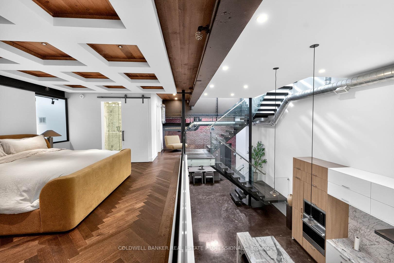 An Architectural Hard Loft Masterpiece. Welcome to The 13 Skylight Loft! A truly spectacular multi-level industrial conversion unlike anything else in Leslieville. This rare residence features soaring 15 and 18 ft ceilings with 13 skylights, including remote operated skylights, flooding the space with natural light and highlighting diamond polished concrete floors and an impressive 18-foot exposed brick feature wall. A dramatic custom floating staircase with solid oak treads and glass railings leads to a striking mezzanine primary retreat overlooking the living space below, creating incredible vertical volume rarely found in Toronto lofts! Complete with herringbone hardwood floors, custom built-ins, and span inspired baths with Kohler fixtures, glass walk-in showers, and a luxurious soaking tub. At the heart of the home, a designer kitchen showcases Italian marble countertops, custom cabinetry and premium appliances including Wolf, Sub-Zero, Miele and a wine fridge anchored by a stunning oversized island. Step outside to your private rooftop terrace with breathtaking Toronto skyline views...the ultimate urban retreat. Additional features include Control4 smart home technology, solid steel mezzanine construction, individual rooftop HVAC, private hot water tank, upgraded designer lighting, double entry, and in-suite laundry. Located in the heart of Leslieville & Riverdale, one of Toronto's most vibrant creative communities. Steps to acclaimed restaurants, cafés, galleries, fitness studios, transit and the future Ontario Line, with quick access to the Gardiner, Lake Shore Blvd, and the DVP. Rental parking available nearby. Parking may be available for purchase.