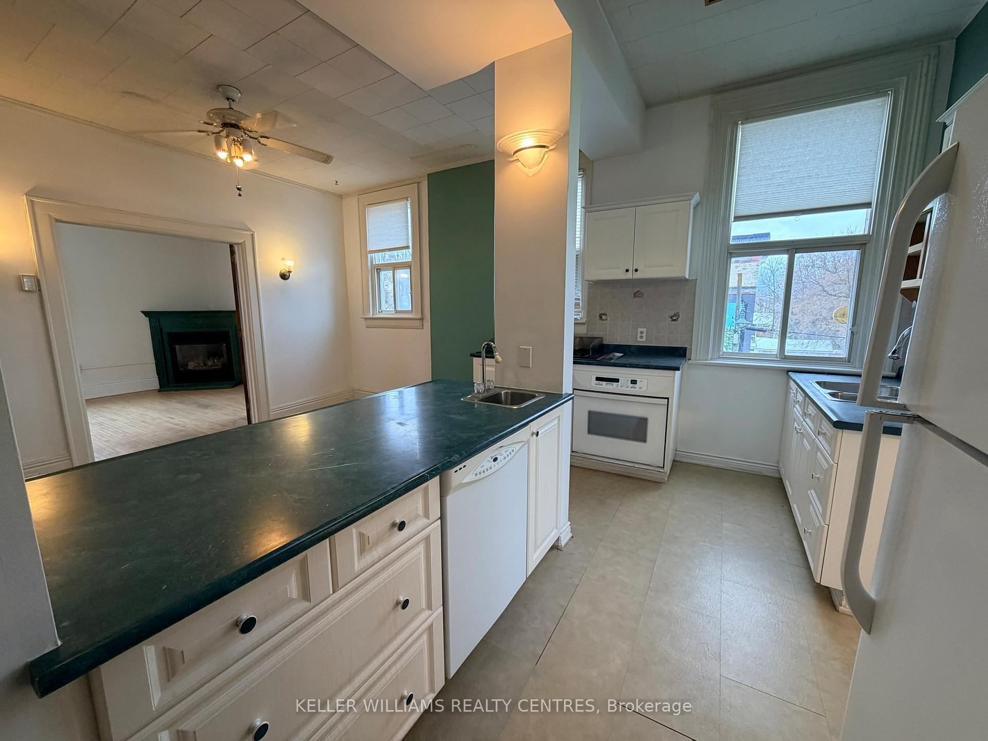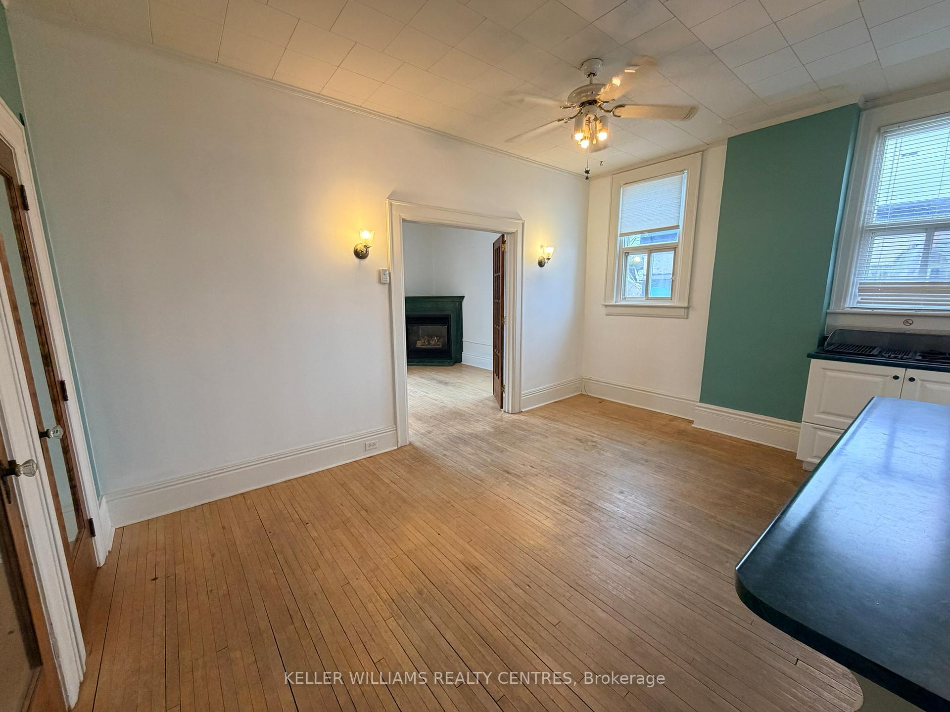 A bright and spacious upper-level residential apartment that spans the full width of the two commercial units below, offering a unique blend of privacy and downtown convenience. This beautifully appointed 1-bedroom, 1-bathroom suite features soaring ceilings, original hardwood floors, and a welcoming gas fireplace perfect for chilly winter nights. Natural light pours in from windows on all sides, creating a warm and inviting atmosphere throughout. With a dedicated laundry area and generous living space, this character-filled apartment delivers comfort, charm, and functionality in the heart of Penetanguishene's historic core.
