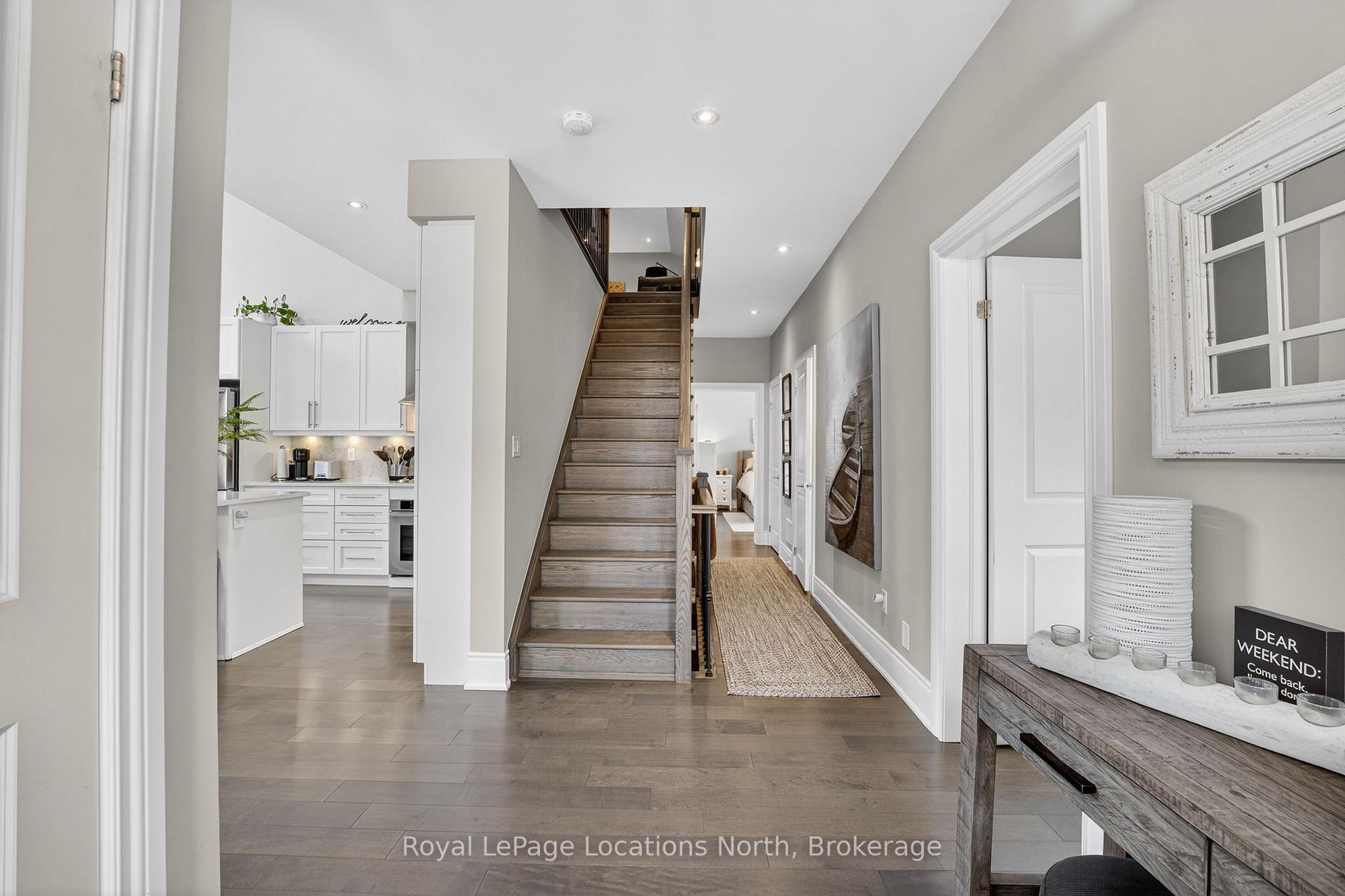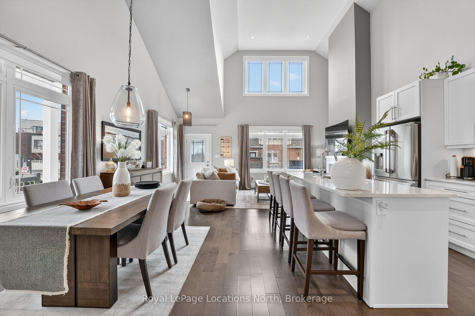 Welcome to this stunning Erie model end-unit townhome in the desirable Shipyards community, perfectly located in the heart of Collingwood. This beautifully designed home offers bright, open living spaces and an exceptional layout ideal for both everyday living and entertaining. Views of the water as well! Step inside to soaring cathedral ceilings and expansive windows that fill the main living area with natural light, creating a warm and inviting atmosphere. The modern kitchen features sleek finishes and a generous island that serves as the perfect gathering space for family and guests. The open-concept living and dining area is centered around a cozy fireplace, making it the perfect place to relax after a day outdoors. The main level offers convenient one-floor living with a spacious primary bedroom, a large private office ideal for working from home (or other bedroom), and a laundry room for added practicality. The double car heated garage provides direct access into the home, allowing for easy entry. Upstairs, you will find two additional generously sized bedrooms along with a bright and versatile sitting area that overlooks the main level. The open balcony design allows natural light to flow throughout the home, creating an airy and welcoming feel. The full unfinished basement could expand the living space even further and can be used as a recreation room, home gym, media room, or hobby space depending on your needs. Located in one of Collingwood's most sought-after neighborhoods, this home offers incredible walkability. Enjoy easy access to grocery stores, boutique shops, restaurants, and local entertainment. Outdoor enthusiasts will love the nearby waterfront trails and the short drive to the slopes at Blue Mountain Resort. This is a fantastic opportunity to live in a vibrant, friendly community while enjoying everything the Collingwood lifestyle has to offer!!