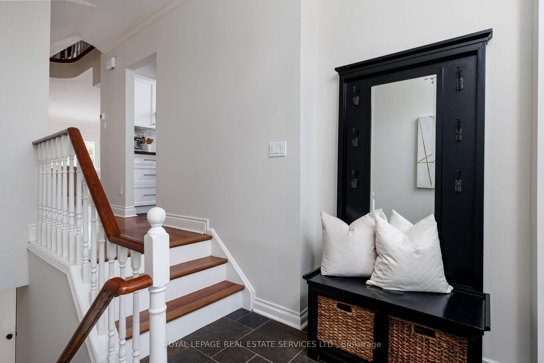 Live the coveted waterfront lifestyle in Bronte, one of Oakville's most desirable neighbourhoods. Stroll to Bronte Heritage Waterfront Park, Bronte Harbour, and Fisherman's Wharf along the shores of Lake Ontario, with vibrant Bronte Village offering cafés, restaurants, boutiques, and everyday conveniences, including Farm Boy. Commuters enjoy quick access to highways and the Bronte GO Station. This beautifully updated freehold townhome in Schooner's Reach offers approximately 2,362 sq. ft. with 3 bedrooms and 2.5 bathrooms, finished top to bottom and designed for entertaining. Spacious living and dining rooms with hardwood floors, a ledge stone fireplace and a walkout to a private, oversized terrace with glass railings and tranquil views of green space, mature trees and Schooner's Reach exclusive-use tennis courts. The upgraded eat-in kitchen features extensive white cabinetry with glass display uppers, granite counters, stainless steel appliances and a large bay window in the breakfast area. The second level includes a family room with French doors and a second fireplace, two bedrooms, an updated 3-piece bath and a laundry room. Privacy awaits in the secluded top-floor primary retreat offering a private balcony and a luxurious 5-piece ensuite with a freestanding soaker tub and frameless glass shower. The lower level provides an office and an inside entry to the double garage. Elegant finishes include California shutters, crown mouldings, hardwood floors, upgraded tile, two wood-burning fireplaces and two walkouts. Major updates include kitchen cabinet refacing and main-level paint (2026), refinished hardwood (2025), furnace and A/C (2024), ensuite vanity (2023) and roof shingles (2019).